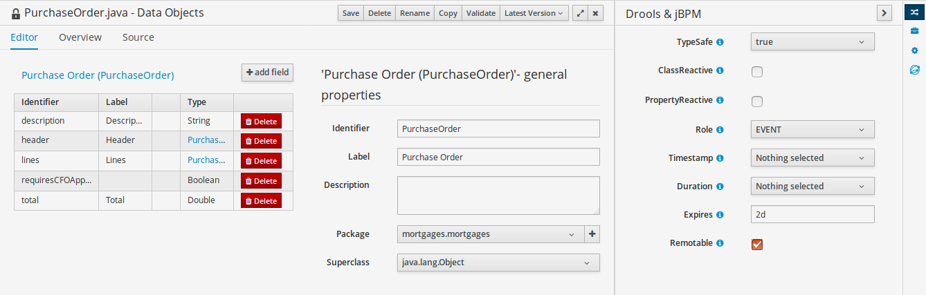 A new web-based data modeler is integrated in the workbench, which allows non-technical users to create data models (to be used in your processes and rules) in a user-friendly manner. These models are saved as Java classes (with the necessary annotations) in the project and added to the kjar upon build and deploy. Check the chapter on Data Modeler in the Workbench Part for all the details.