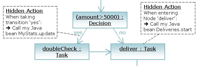 The transition will pass on the execution to the decision node and invoke the execute method. Let's assume the decision's execute implementation performs a calculation and decides to propagate the execution by sending the 'yes'-event to the execution. That will cause the execution to continue over the 'yes' transition and the execution will arrive in the task 'doubleCheck'.