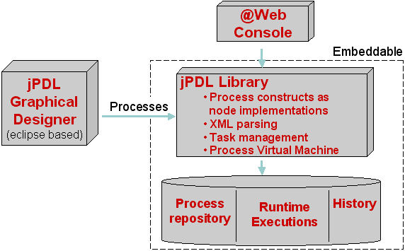 jPDL has minimal dependencies and can be used as easy as using a java library. But it can also be used in environments where extreme throughput is crucial by deploying it on a J2EE clustered application server.