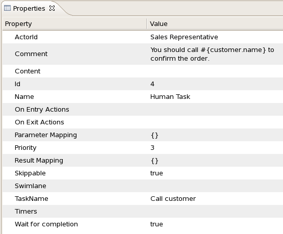 In many cases, the parameters of a user task (like for example the task name, actorId, or priority) can be defined when creating the process. You simply fill in the value of these properties in the property editor. It is however likely that some of the properties of the human task are dependent on some data related to the process instance this task is being requested in. For example, if a business process is used to model how to handle incoming sales requests, tasks that are assigned to a sales representative could include information related to that specific sales request, like its unique id, the name of the customer that requested it, etc. You can make your human task properties dynamic in two ways: