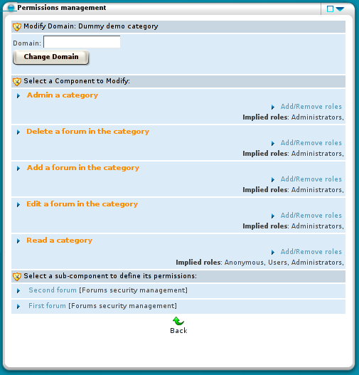 Under the global permissions, there is a list of sub-components for a finer grain permission definition. For example, the forums portlet gives the ability to define permissions on a single category. By clicking on the category, the following screen would show up: