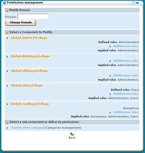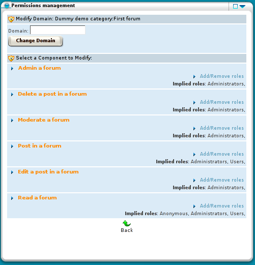 Under the global permissions, there is a list of sub-components for a finer grain permission definition. For example, the forums portlet gives the ability to define permissions on a single category. By clicking on the category, the following screen would show up: