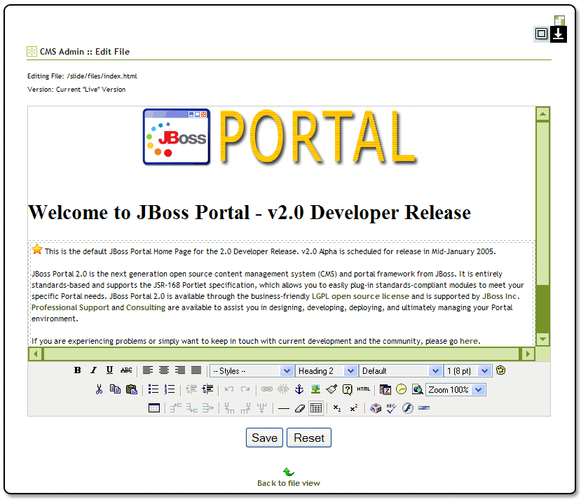 The edit file window allows a user to edit a text or HTML file using the embedded WYSIWYG HTML editor. The