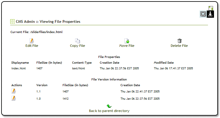 Version Information is also contained on this screen. It is important to note that the top-most version in the list is the current version that is "live". Editting an older version of a file and saving it, will auto-create a new version of the file and make it the current "live" version.