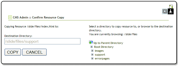 The copy resource window allows a user to copy files to any folder on the system, as well as copy whole directory