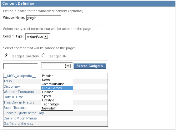 Portlet definitions can be made available by different providers. You can select the provider you want to browse by selecting it in the drop-down menu and clicking View portlets. By default, two providers are available: