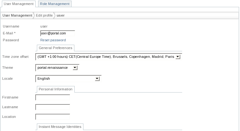 This section covers the user management of the IdentityUserManagementPortlet which is displayed by default. For role management please see Section 4.2, “Managing Roles”.