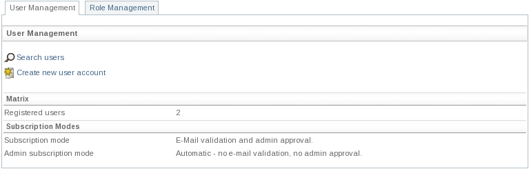 The first page of the user management portlet displays some user related actions (eg. Search users, Create new user account) and some additional information (e.g. Registered users and Subscription mode). The registered users represent the count of all registered users and the subscription mode describes the required tasks for registering a user (i.e. first e-mail validation and then approval by the administrator). The Subscription mode symbolizes the mode used in the User portlet. The Admin subscription mode represents the mode used in the User management portlet.