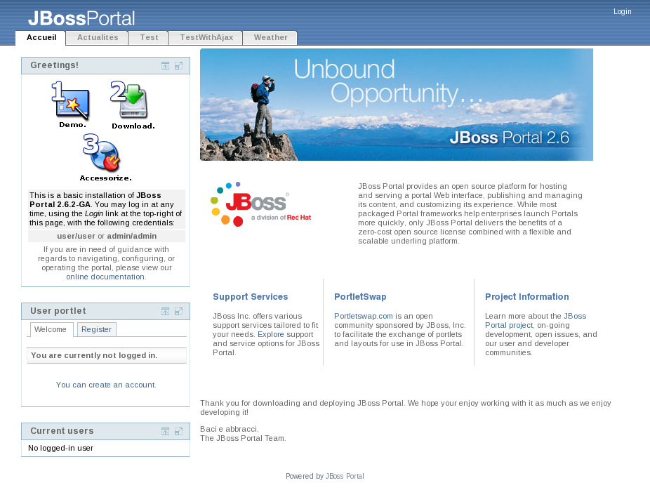 JBoss Portal provides an open source and standards-based environment for hosting and serving a portal's Web interface, publishing and managing its content, and customizing its experience. It is entirely standards-based and supports the JSR-168 portlet specification, which allows you to easily plug-in standards-compliant portlets to meet your specific portal needs. JBoss Portal is available through the business-friendly LGPL open source license and is supported by Red Hat Middleware, LLC Professional Support and Consulting . JBoss support services are available to assist you in designing, developing, deploying, and ultimately managing your portal environment. JBoss Portal is currently developed by Red Hat Middleware, LLC developers and community contributors.