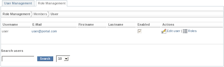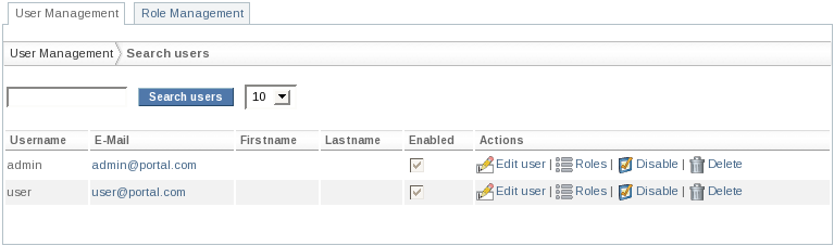 This section covers the user management of the IdentityUserManagementPortlet which is displayed by default. For role management please see Section 4.2, “Managing Roles”.