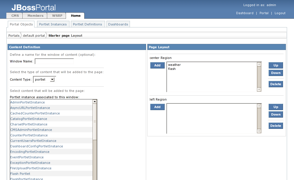 Now you can add this portlet instance to the Starter portal page. Click on the "Portal Objects" tab and navigate to the "Page layout" page of "Starter" portal page as we did in the last section. Select "Flash Portlet" from the portlet list, click the "Select" button, and add it to center of the "Starter" portal page with a name of "flash" (Figure 47).