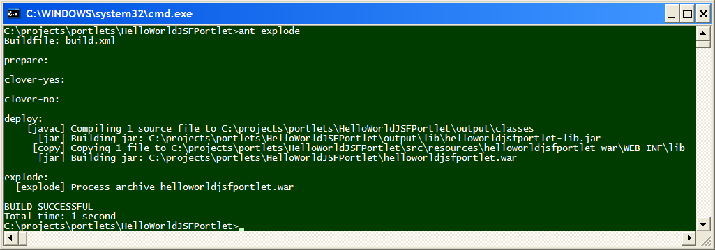If you have downloaded the sample, you can execute the build.xml with ANT or inside your IDE. Executing the deploy target will compile all src files and produce a helloworldjsfportlet.war under HelloWorldJSFPortlet\helloworldjsfportlet.war.