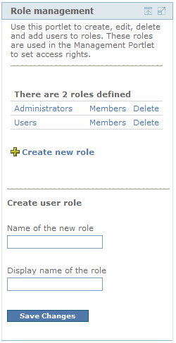 Creating new roles, is accomplished by first clicking on the Create New Role link in the RolePortlet.