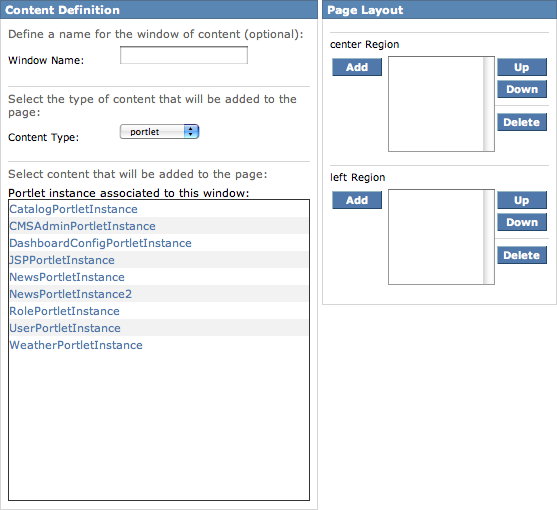 You can add, remove and reorder portlets on a dashboard page to adapt your environment to your liking. To do so, just select the page you want to modify using the page popup selector and use the portlet management form. We will not explain how to use it here as it is similar to the page layout functionality of the Admin portal, which we will look at in Section 2.2.1.3, “Looking at a page configuration”