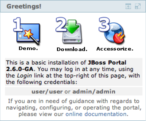 Displays hard-coded links to downloading JBoss Portal, downloading portlets from PortletSwap, and the live online JBoss Portal demo. It also contains default authentication information on loging in, as well as a link to the official Portal documentation.