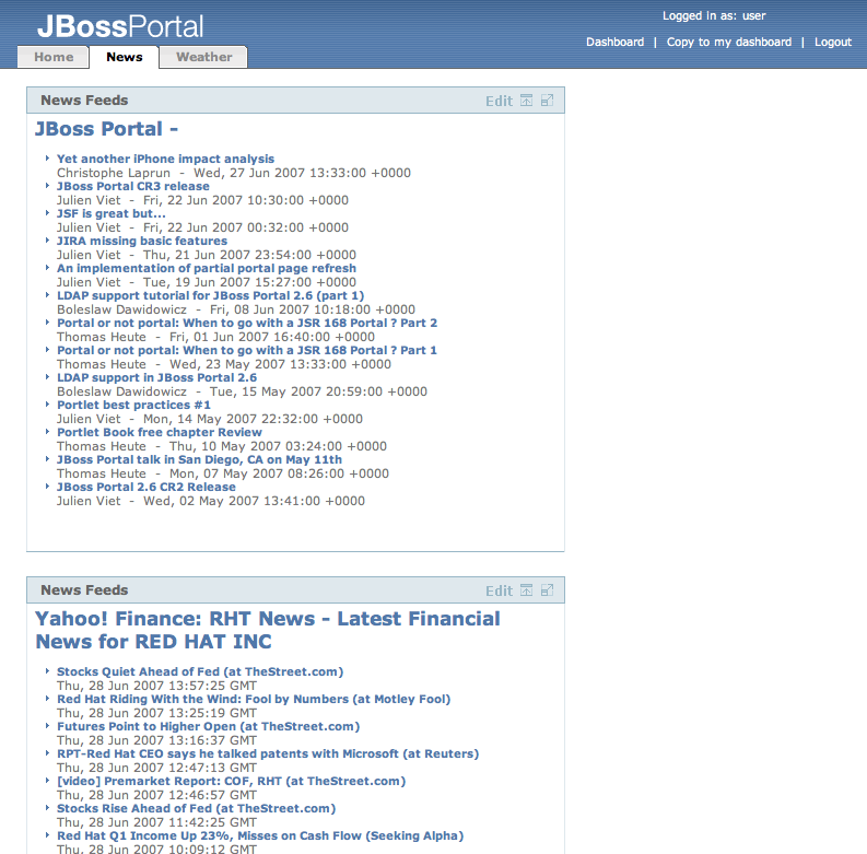 Three pages are available in the default Portal: Home, News and Weather. You can access pages either by entering the page URL in your browser location bar, as shown in Section 1.1.2, “Pages”, or by clicking the tab associated to the page in the Navigation Tabs at the top of the page.