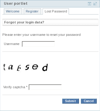 Already registered users can request a new password by clicking on the "Lost password" link in the navigation of the portlet. Therfore the user needs to fill in his user name to receive an e-mail with his new login credentials.