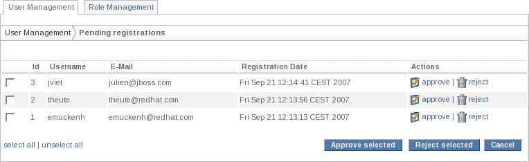 Click on the Show pending registrations link to show all registrations with validated e-mail addresses. You can approve or reject each user by clicking on the corresponding action or click on select all to approve or reject all selected users.
