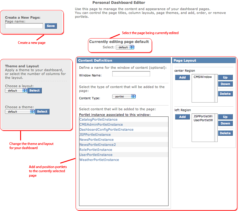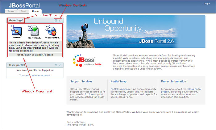 The diagram above, shows the default JBoss Portal page with certain window-related items highlited (in red). Lets look at these items: