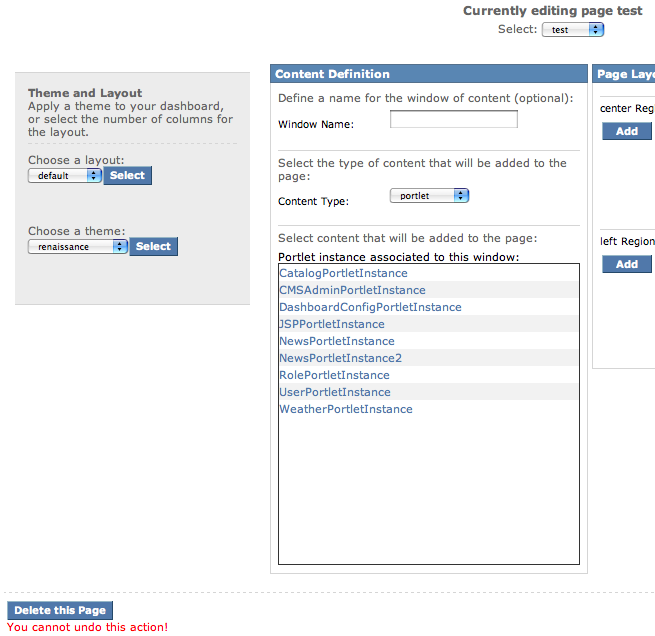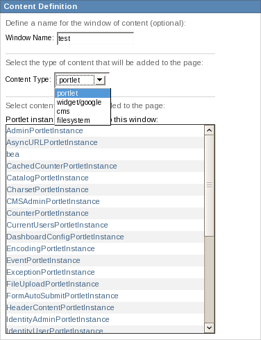 The wizard mode is a fast and easy way to create a new window on a page backed by a portlet instance. The user just needs to define which portlet definition to use, where should the instance be located (portal / page / location on the page) and the wizard will automatically create a new instance of the portlet, create a window for it and add that window to the specified region on the page defined by the user.