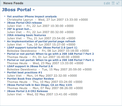 Kev "kevs3d" Roast for supplying us with two working portlets that integrate existing frameworks in to the portal: Sun JSF-RI and Spring MVC portlets.