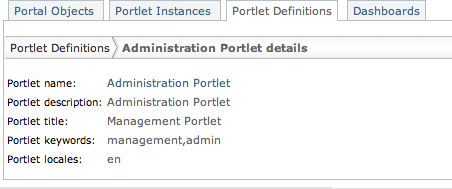 Clicking on a portlet name in the list will display the portlet definition title, description, supported languages and keywords.