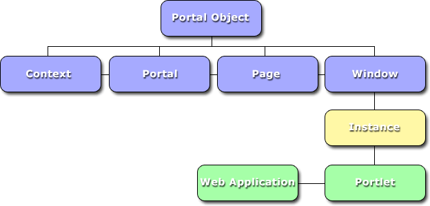 JBoss Portal supports multiple portal instances running within one container. A portal instance can be viewed as a 'bucket', containing portal objects such as, Portal Pages, Themes, Layouts, and Portlet Windows. It also manages the relationship between the user and the portal itself. The hierarchy of portal objects is depicted as follows: