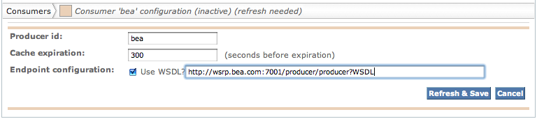 You should now see a form allowing you to enter/modify the information about the Consumer. Set the cache expiration value to 300 seconds and enter the WSDL URL for the producer in the text field and press the "Refresh & Save" button: