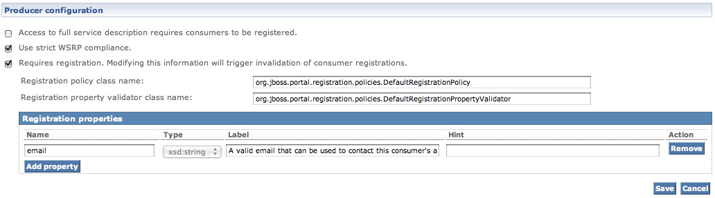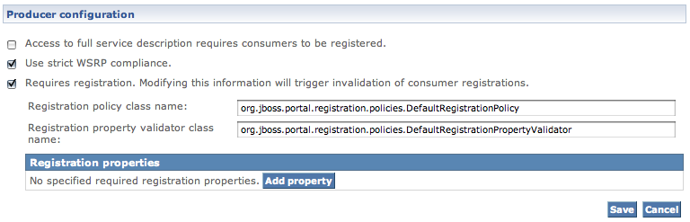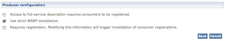 We will allow unregistered consumers to see the list of offered portlets so we leave the first checkbox ("Access to full service description requires consumers to be registered.") unchecked. We will, however, specify that consumers will need to be registered to be able to interact with our producer. Check the second checkbox ("Requires registration. Modifying this information will trigger invalidation of consumer registrations."). The screen should now refresh and display: