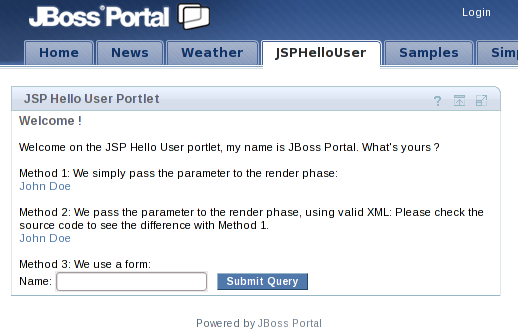 <%@ taglib uri="http://java.sun.com/portlet" prefix="portlet" %> <div class="portlet-section-header">Welcome !</div> <br/> <div class="portlet-font">Welcome on the JSP Hello User portlet, my name is JBoss Portal. What's yours ?</div> <br/> <div class="portlet-font">Method 1: We simply pass the parameter to the render phase:<br/> <a href="<port