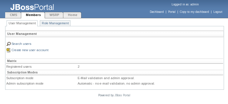 This chapter covers the administrator functions made available by the User management portlet. For end-user operation, see: Section 1.2.3.2, “Identity User Portlet”. Administrative functions are available once you are logged in with the proper credentials (admin/admin), then going to the Section 1.4, “Admin Portal” and then the Members Page tab. You can change between user and role management by clicking on the corresponding links in the top of the portlet.