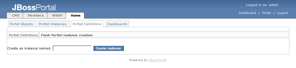 A list of all portlets will be displayed. Click on the "Create Instance" action link for the "Flash Portlet". This will bring up a view similar to Figure 45 that will allow you to name the new portlet instance.