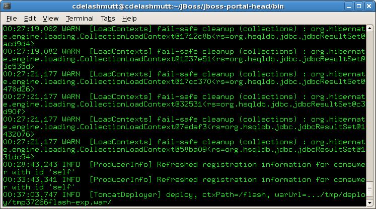 This ZIP file contains both the binary and the source for the portlet. Open the zip and extract the flash.war file. Place this file in the $JBOSS_HOME/server/default/deploy directory. The console for the JBoss Portal will show the portlet being deployed (Figure 43).