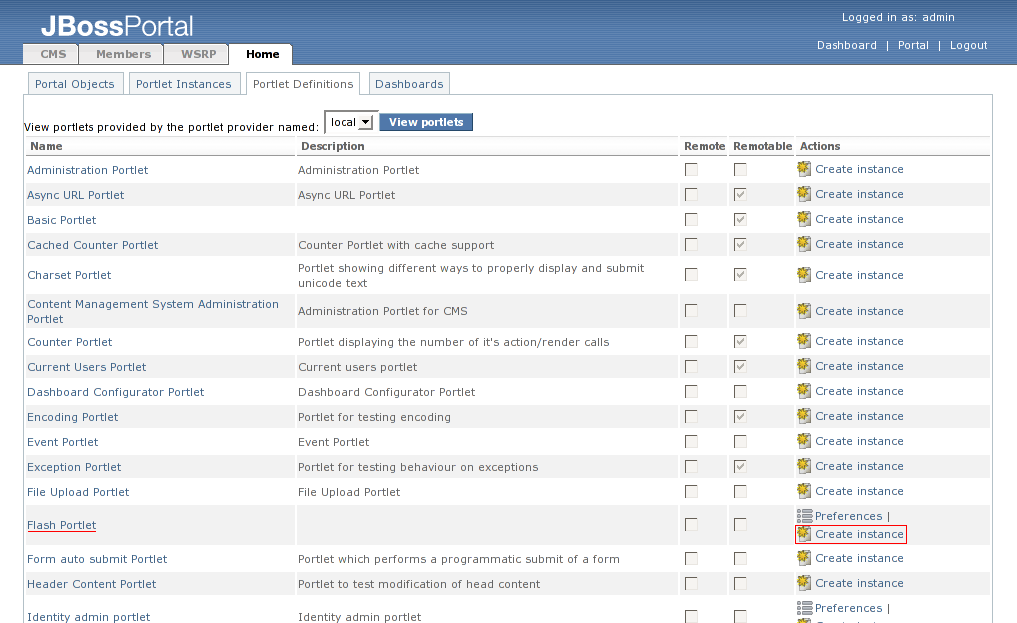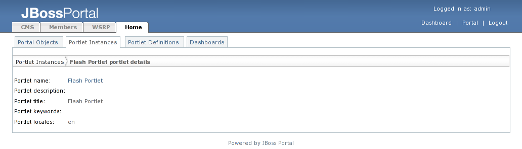 Type in "Flash Portlet" as the instance name in the textbox at the bottom of the page, and click on the "Create Instance" button. The resulting view will show the summary information about the "Flash Portlet" portlet instance that we created. (Figure 46).