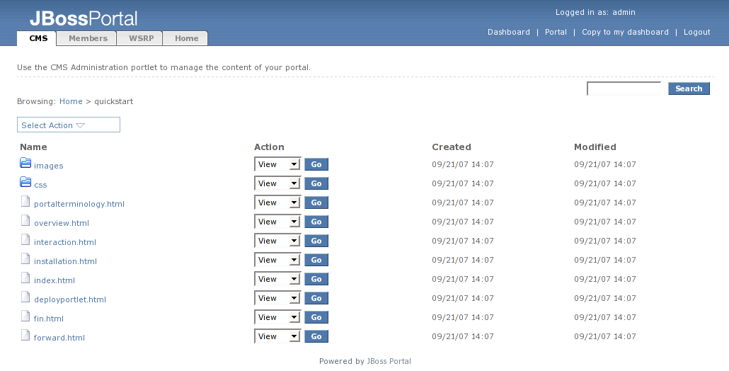 Click on the quickstart link to see the HTML files and sub-directories that were uploaded (Figure 15). Click on the "Home" link from the breadcrumbs at the top of the portlet to return to the top directory of the content manager repository (back to Figure 14).