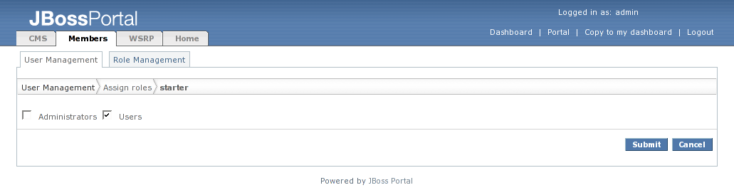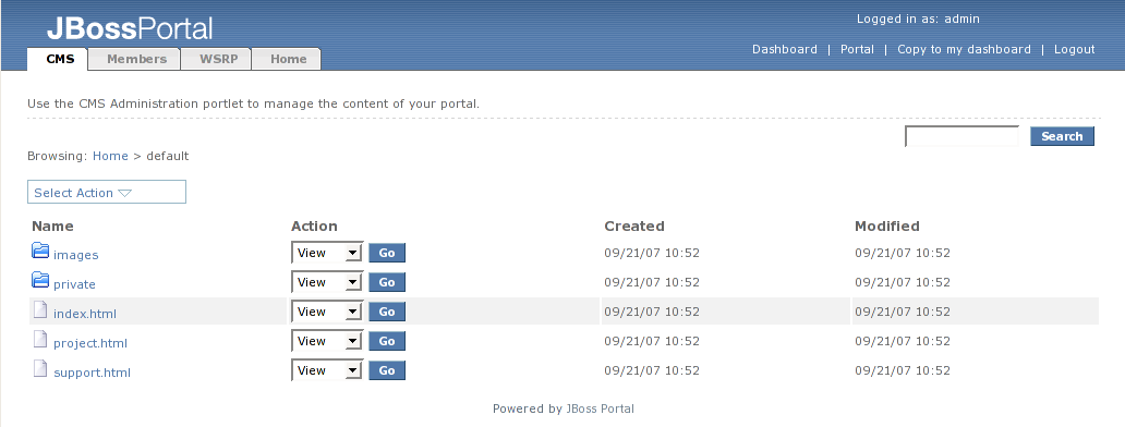 Click on the Admin link in the upper right of the browser page. From this Admin Portal, you should have access to the CMS, Members, WSRP and Portal management interfaces. (Figure 24).