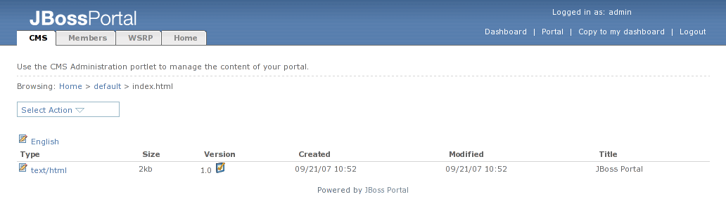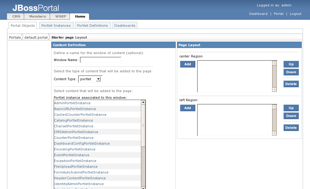 Now that we are logged in, there is a portal page available for the content management and portal administration. Click on the "Admin" link, and then on the "CMS" tab. The CMS Admin portal page displays (Figure 11).