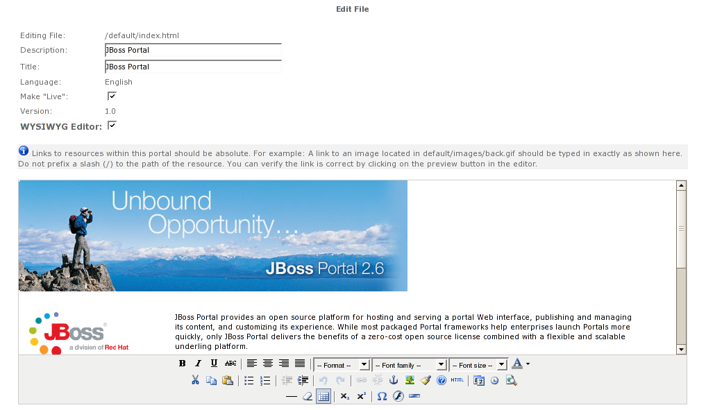 Click on the "Portal" link in the upper right corner of the browser page to see the changes we have made. The content view portlet shows the updated version of the index.html page we edited above (Figure 22).