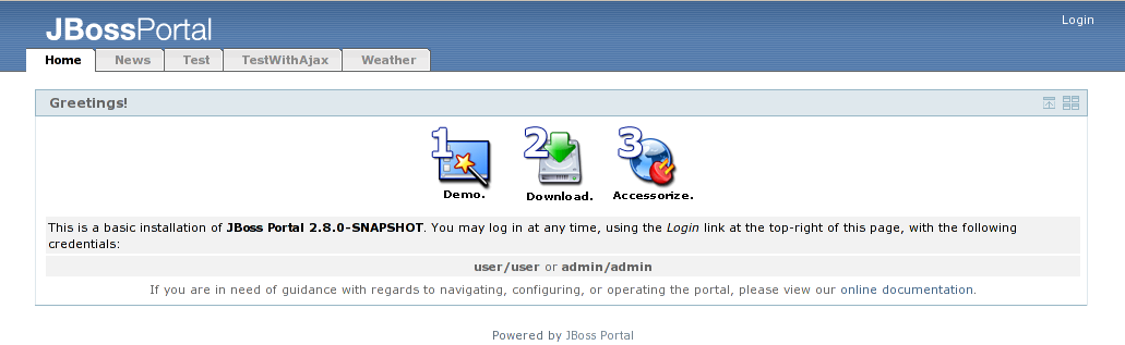 Each portlet in the portal page can be interacted with individually. Let's interact with a couple of portlets, and see the results. Click on the minimize icon on the "Greeting" portlet. The portlet is then minimized (Figure 5):