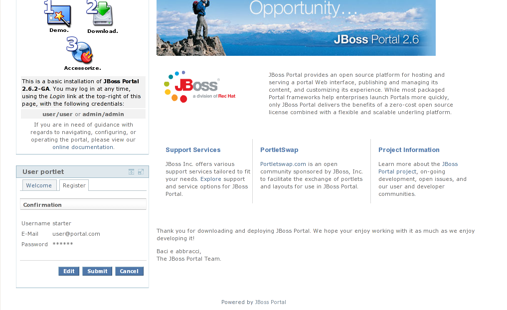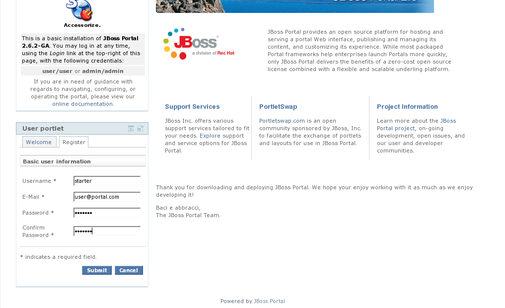 Let's create a user for the portal. Click on the "Register" tab in the user portlet. The basic create user view now shows in the user portlet. Enter the information as shown in Figure 7 (password is starter). Once you have clicked "Submit" button, the user creation confirmation screen will show up (Figure 8). Validate the user information and then click on the "Submit" button to finish the creation of the new user.