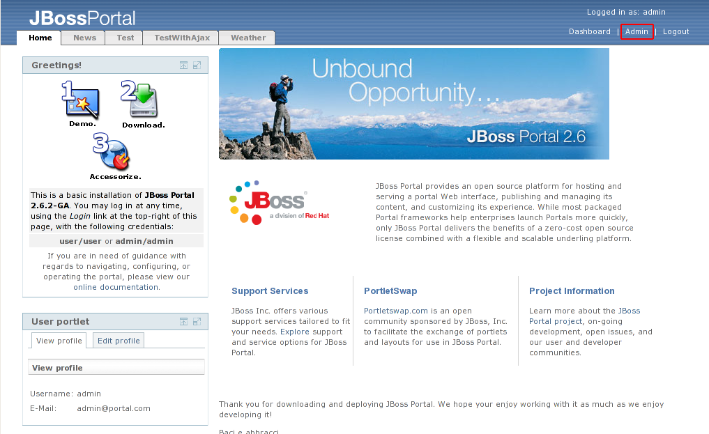 Click "Login", and the portal will now show us a link to the Admin portal (top-right) (Figure 10).