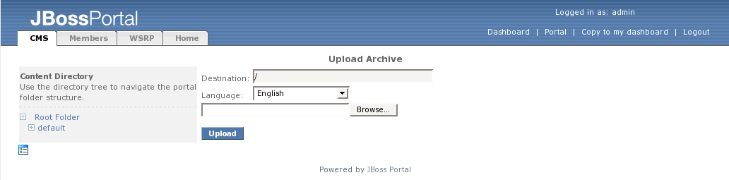 The content management portlet allows users to create/delete files and folders, edit text/HTML files, and batch upload files. These files are then viewable through the content view portlet. HTML files can refer to other HTML files through the directory structure in the CMS. Different groups or departments in an organization can have their own area (directory structure) for the files/HTML pages they want to share on the Portal. Let's batch upload a set of HTML pages with images and style sheets. Mouse-over the "Select Action" dropdown menu, and click on the upload archive link. The upload archive view shows (Figure 12).