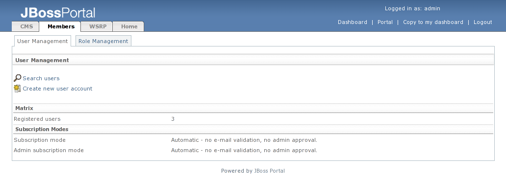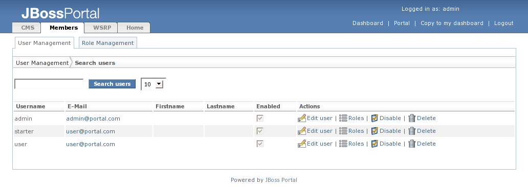 Click the "Members" tab to access the member management page. Click on the "Search users" link to see all of the users currently enrolled in the portal security repository (Figure 25).
