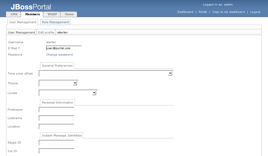 Now let's look at the user profile for the starter user. Click on "Search Users" again to get back to the user result list, and then click on the "Edit user" link next to the starter user. The user profile view appears (Figure 28).
