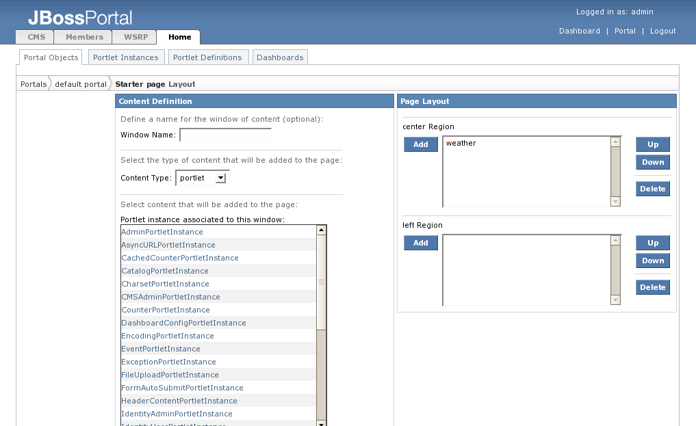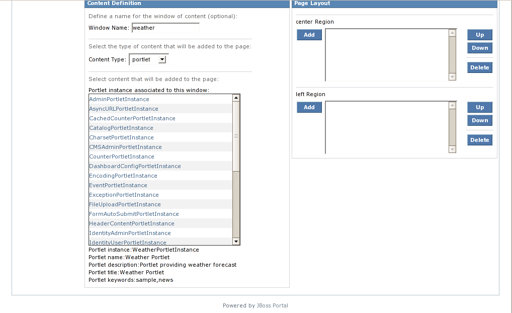 Scroll up to the list box that is labeled "center Region". Click the "Add" button to the left of that list box. The "weather" portlet instance is now shown under the "center Region" (Figure 35).