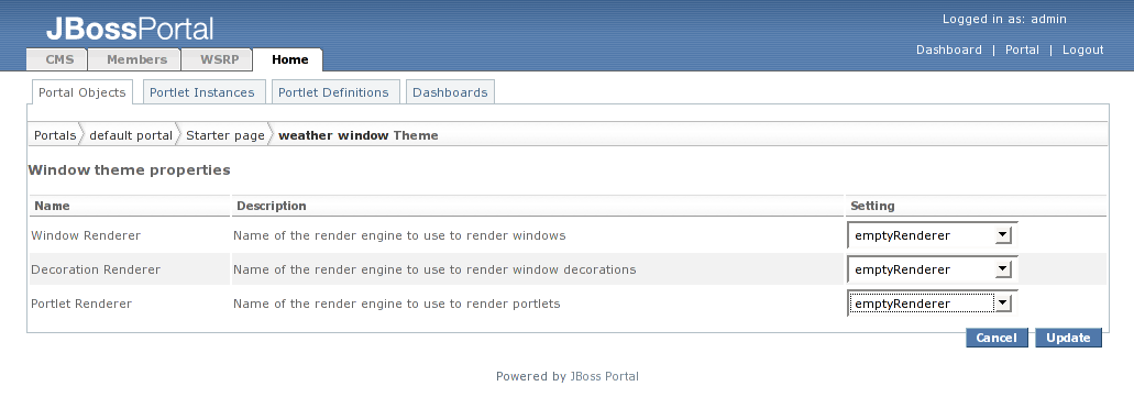 Let's change the theme for the weather portlet window we just added so that the weather portlet window doesn't display any decorations. Just below the "Portal Objects" tab near the top of the page is a breadcrumbs list that shows us we are in the "Portals" management section, in the "default" portal, and in the "Starter" page layout. Each of the elements in the breadcrumbs list is a link that will allow you to navigate back to other portal components. Click on the "Starter page" link in the breadcrumbs. In the resulting view under the "Manage windows within Starter page" section, click on the "theme" action link next to the "weather" window. Let's set the Window Renderer, Decoration Renderer, and Portlet Renderer to "emptyRenderer" (Figure 36).
