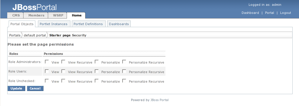Click the "Update" button to apply the theme changes. Finally, let's take a look at security in the Management Portlet. Click on the "Starter page" link in the breadcrumbs below the "Portal Objects" tab. Next click the "Security" link just under the "Manage Starter page" section title, and the list of available roles and actions is shown for the "Starter" portal page.(Figure 37).