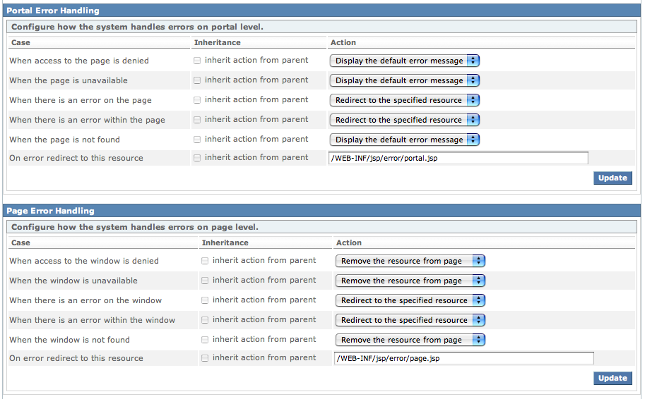 The portal error-policy controls the response sent to the Web browser when an error occurs. A default error policy exists, which can be configured per portal. If an error occurs, the policy can either handle a redirect to a JSP page, or ignore it. If the error is ignored, it is handled by the default policy, otherwise a JSP page is invoked with the appropriate request attributes, allowing page customization.
