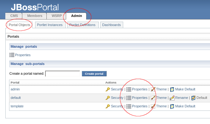 Click the Admin tab to open the portal management application, and then click the Portal Objects tab to display available portals.