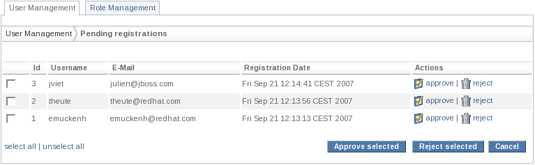 Email verification: The users can receive an email with a link on which they must click to confirm the creation of the new account. (Disabled by default,see Section 18.2.4, “jBPM based user registration”)